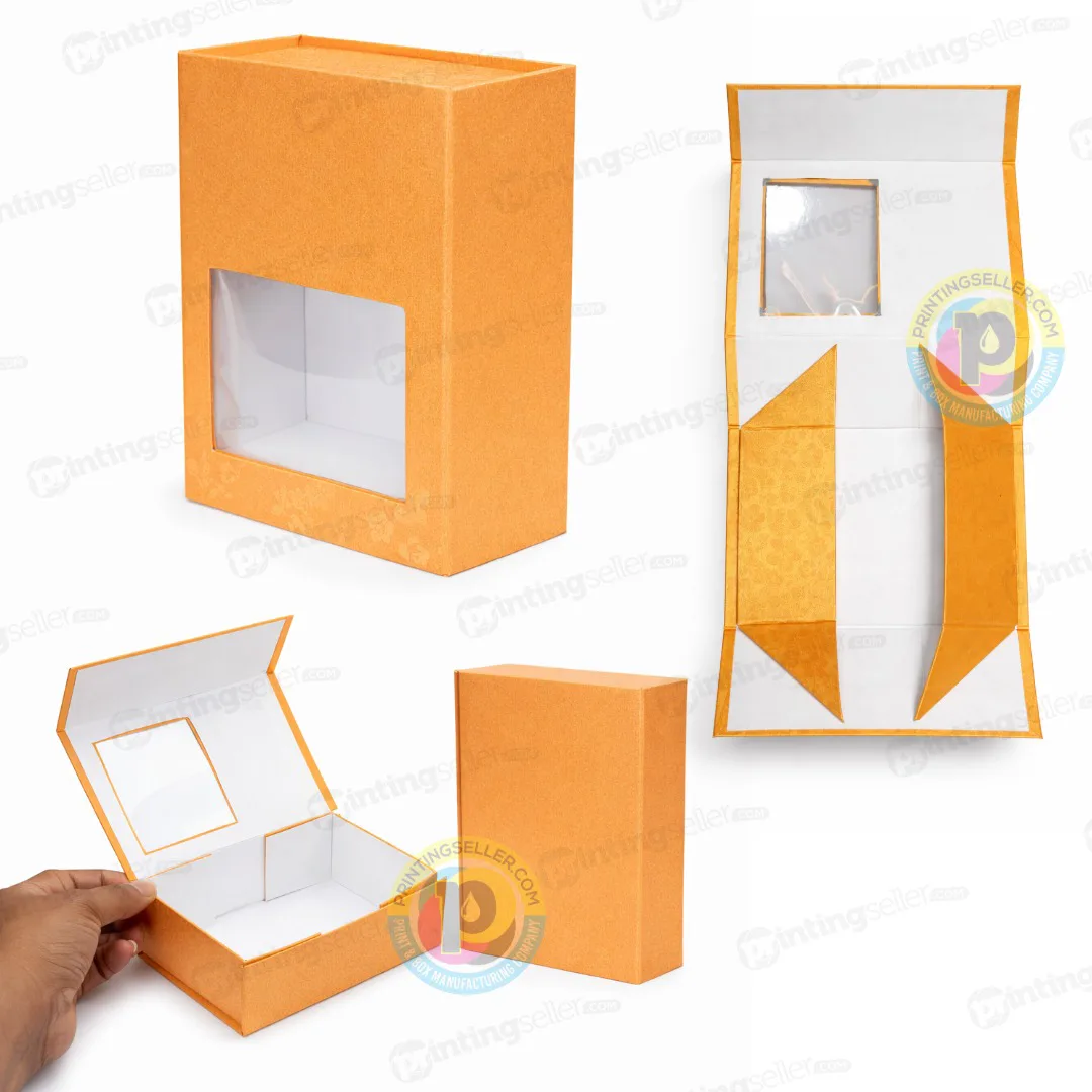 Our Collapsible Multipurpose Gift Box with Transparent Window is a premium rigid packaging solution designed for luxury presentation and convenient storage. As shown in the images, the box features a sturdy structure with a clear window on the lid, allowing elegant product visibility while maintaining a high-end look.