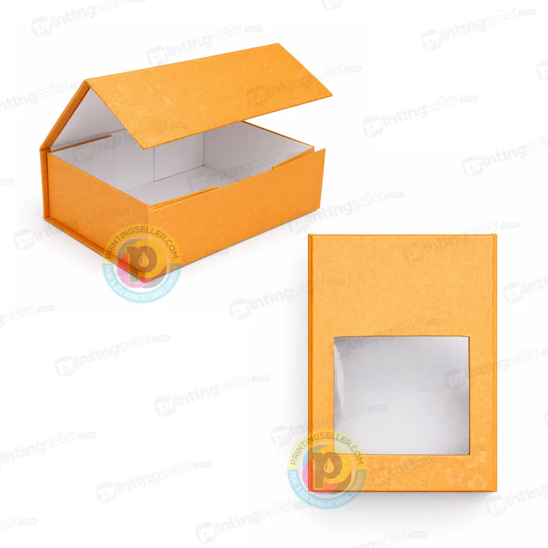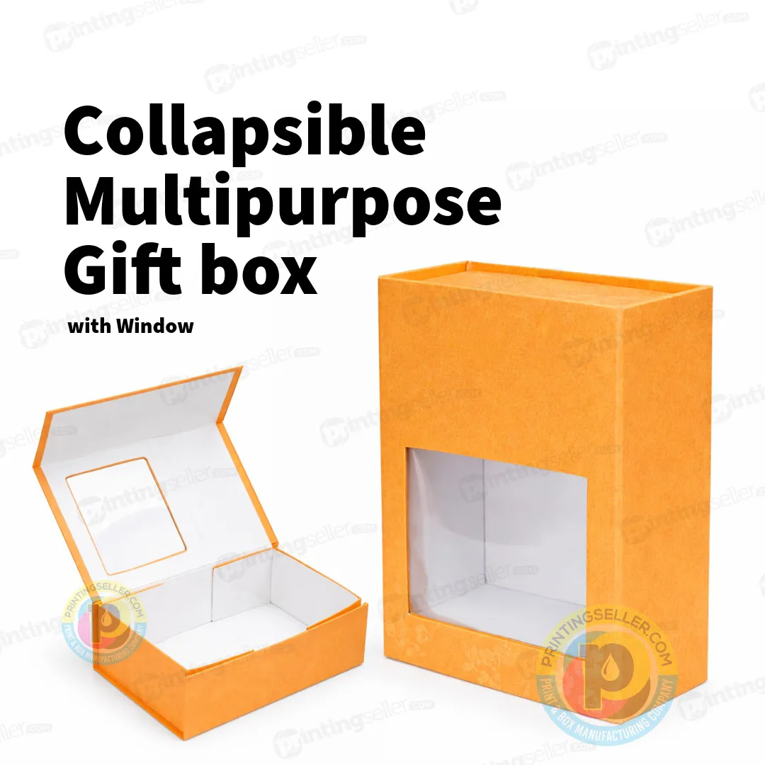 Premium collapsible multipurpose gift box with transparent window and magnetic closure. Strong rigid structure, space-saving foldable design, and elegant finish—ideal for gifting, sweets, hampers, and retail packaging.