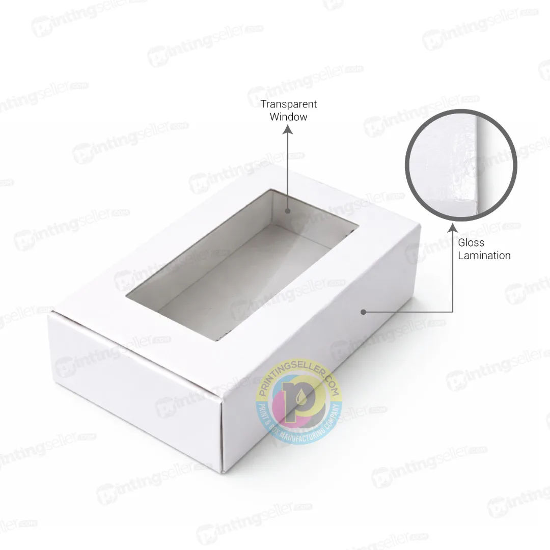 Plain white multipurpose box with a transparent window, made from both side white paper with gloss lamination. Ideal for bakery items, gifts, cosmetics, sweets, and retail display packaging.