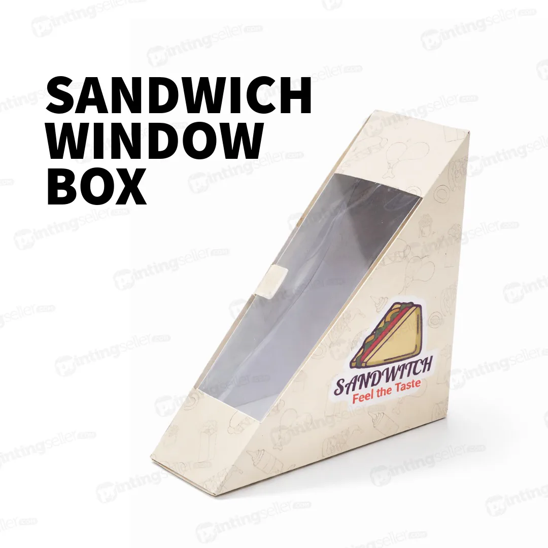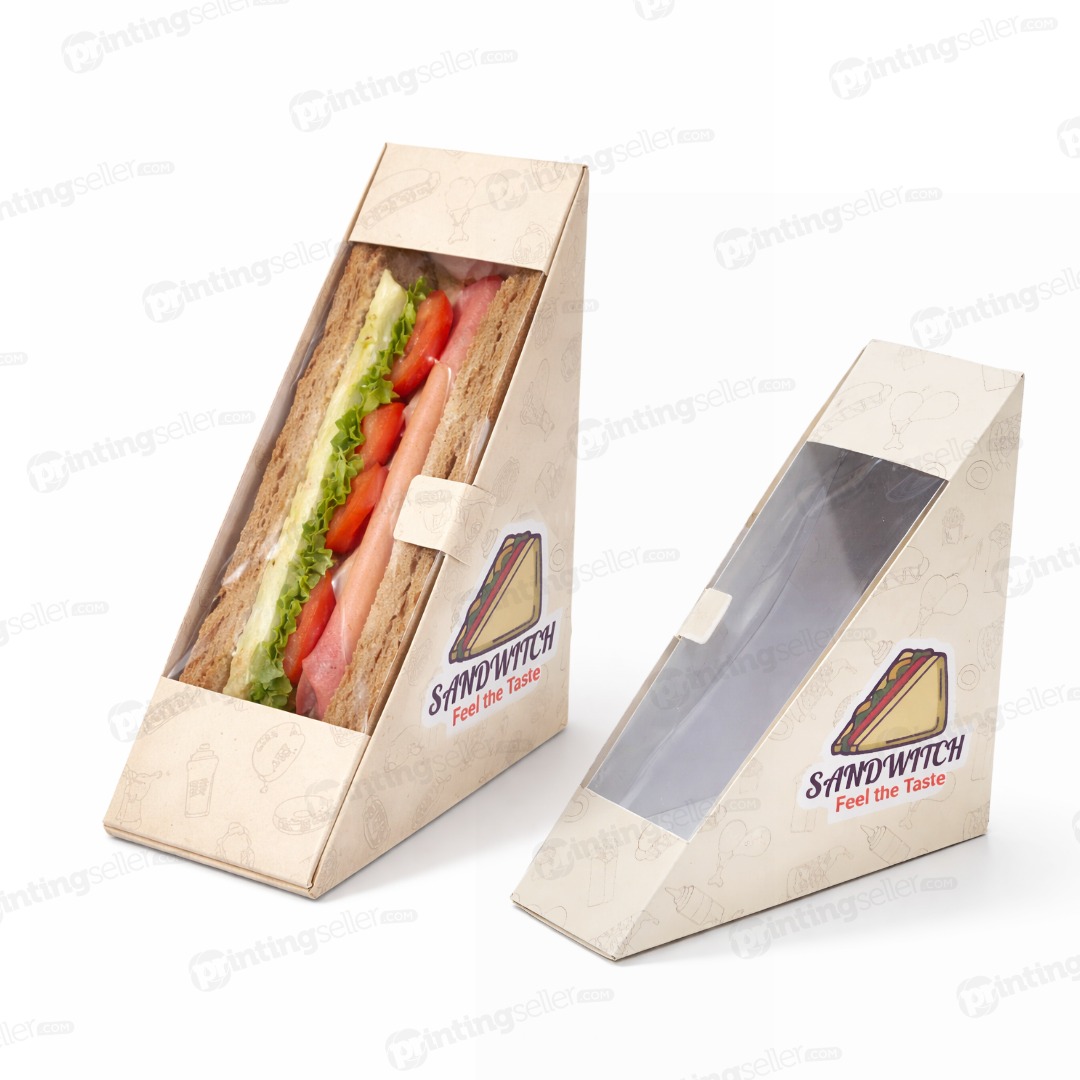 Readymade printed sandwich box with gloss lamination finish. Strong, food-safe, and ideal for bakeries, cafés, food stalls, and takeaway packaging.